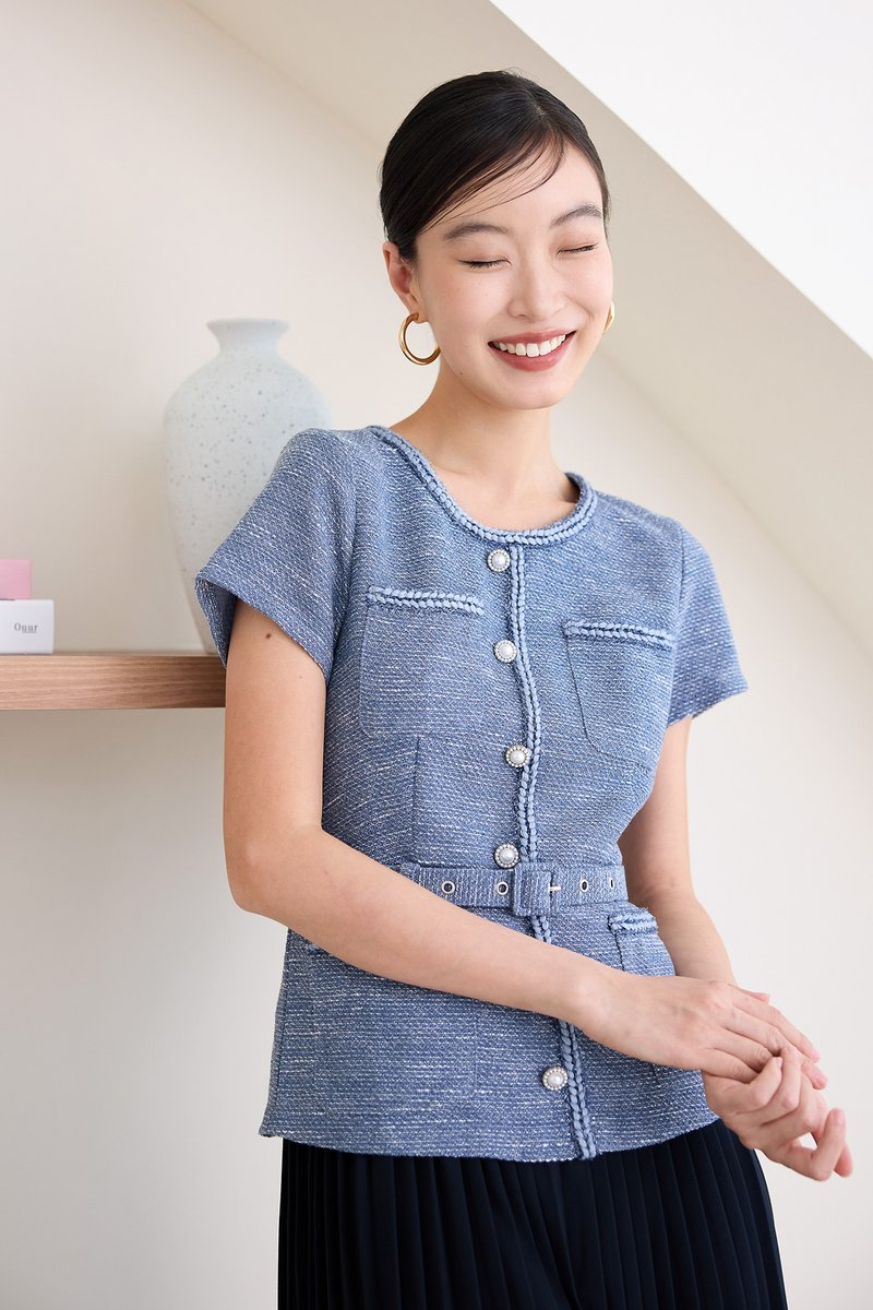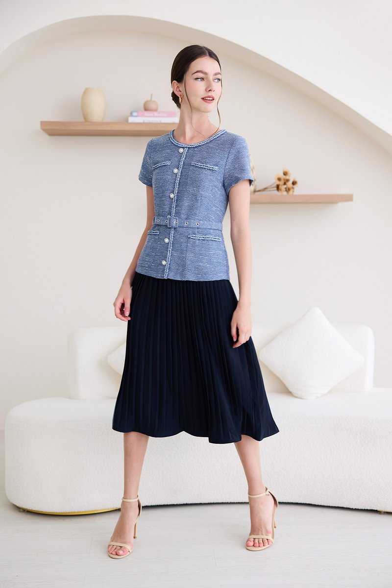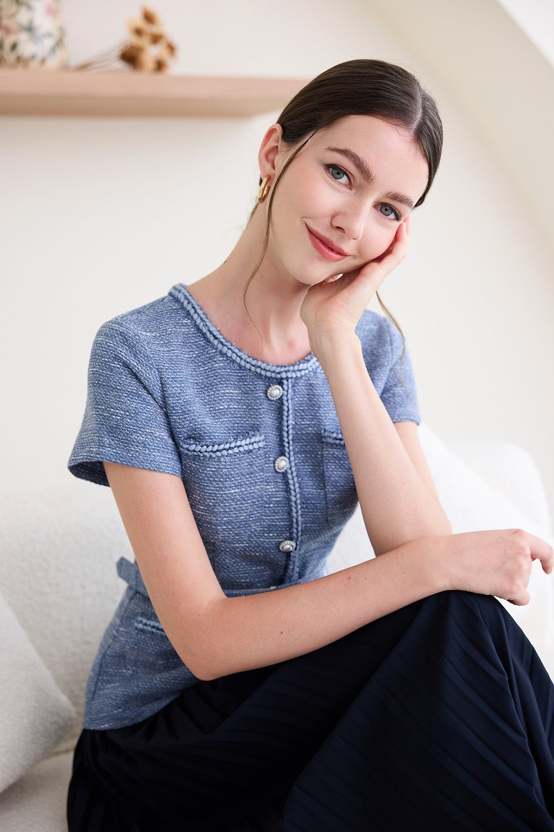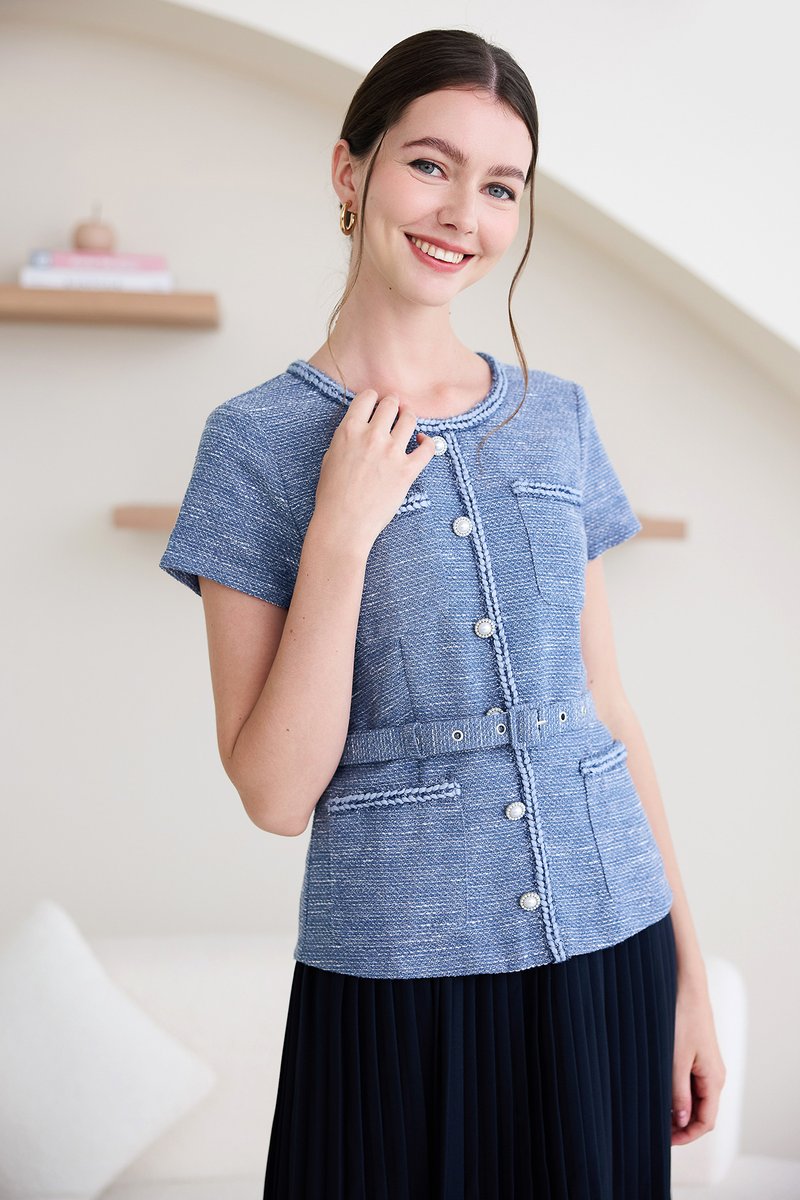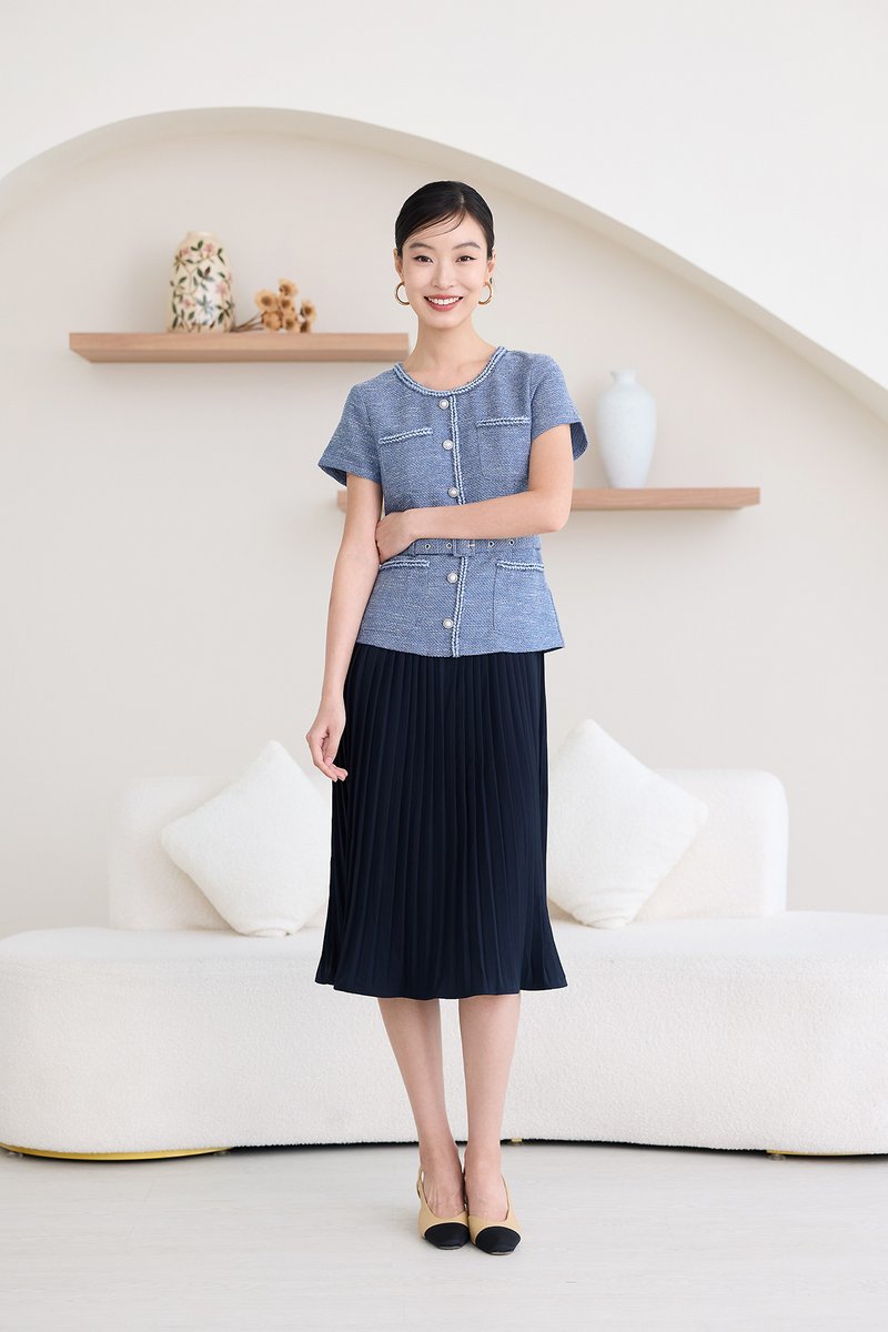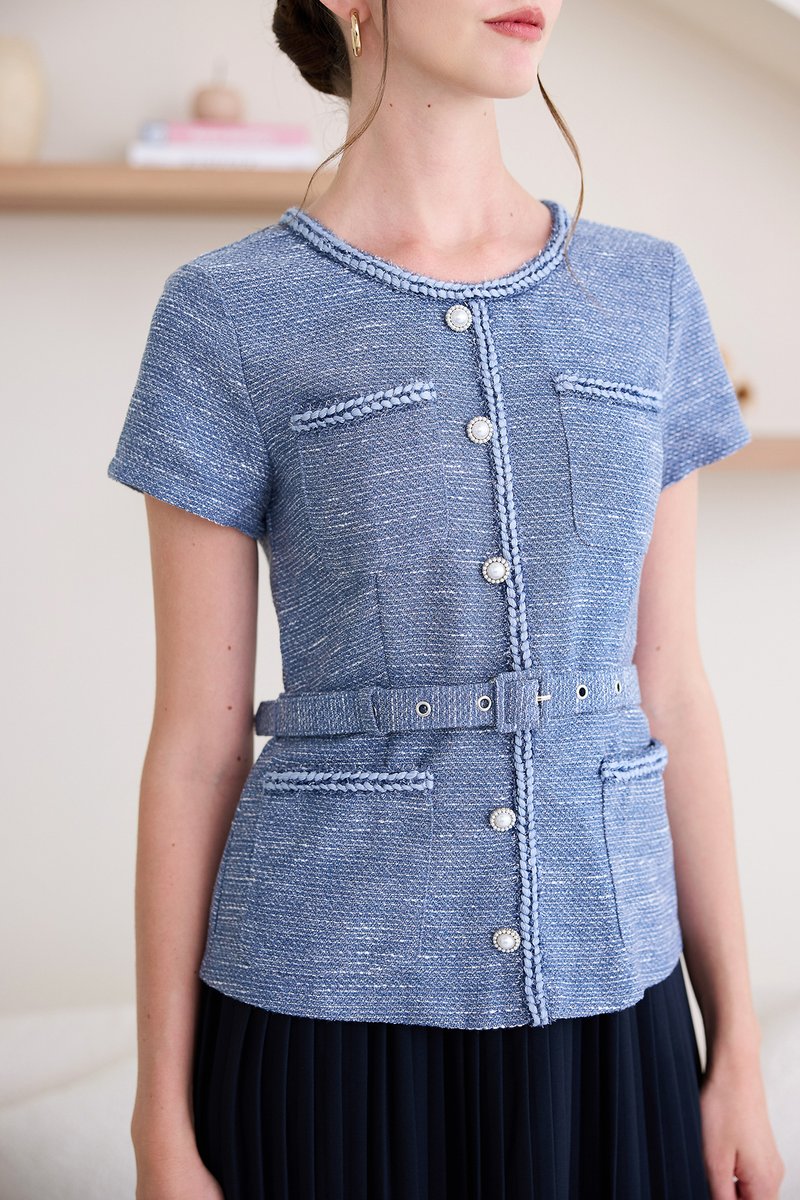 top: tweed material, non-stretchable