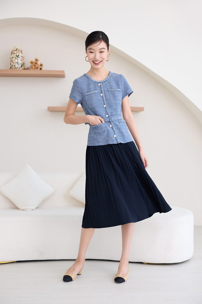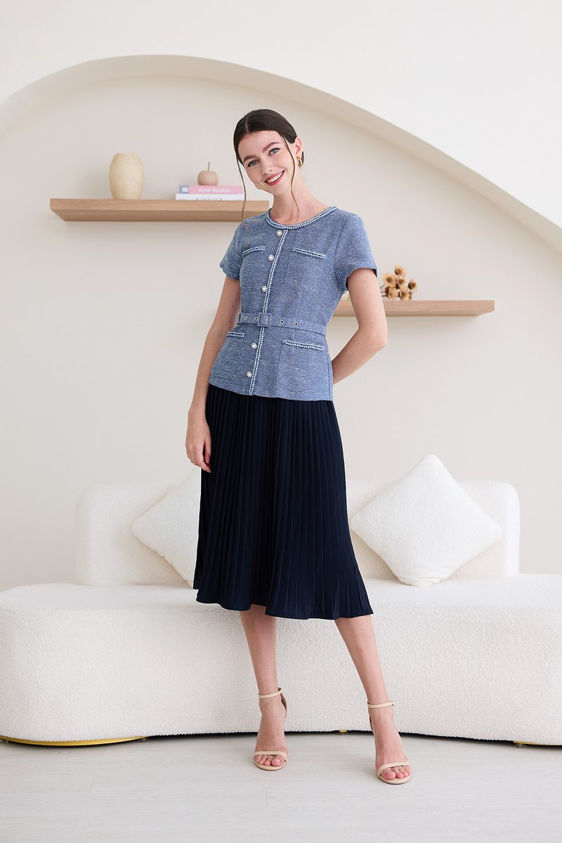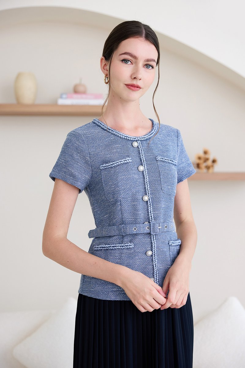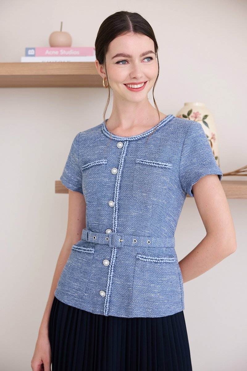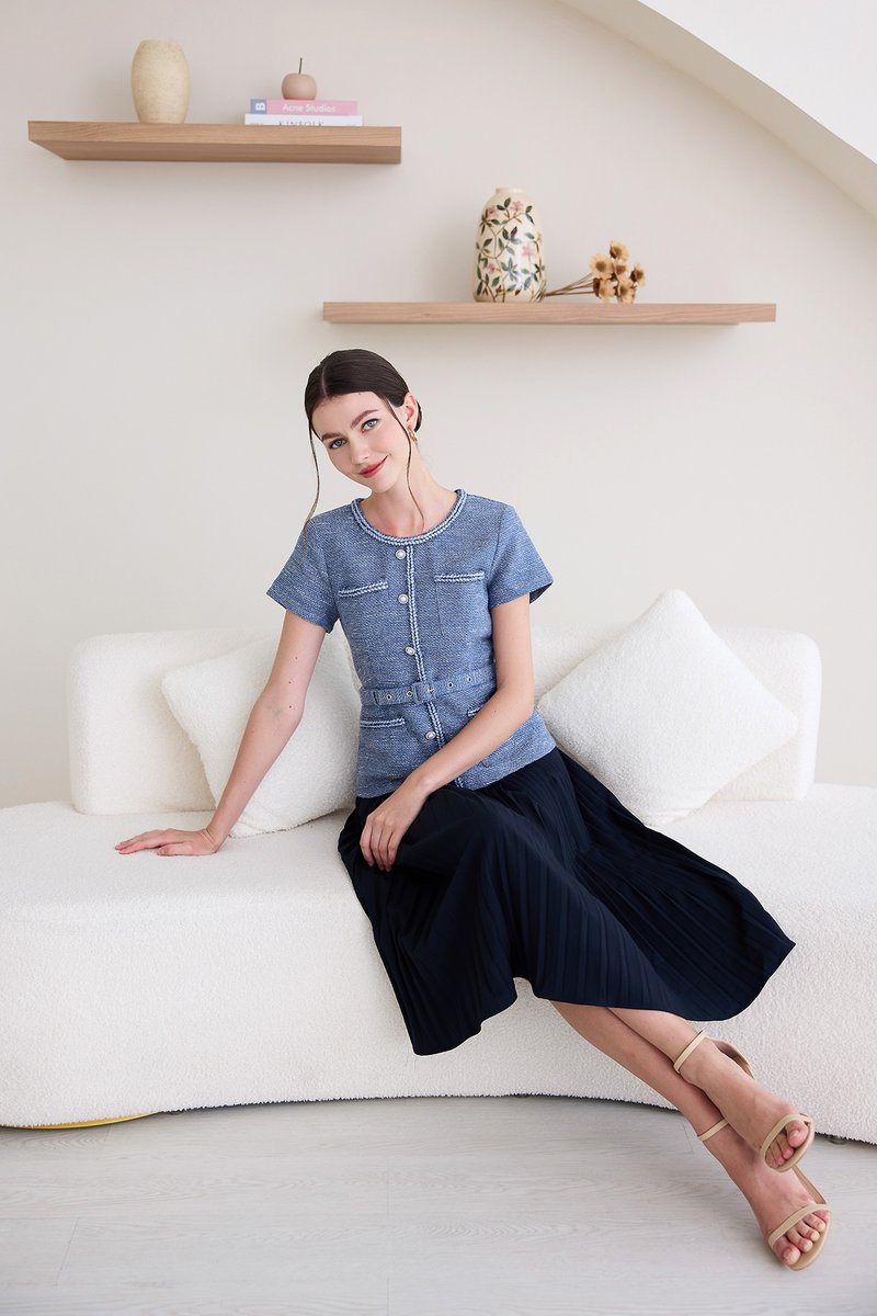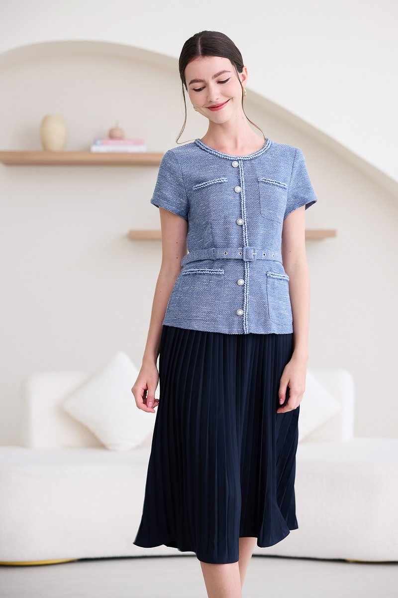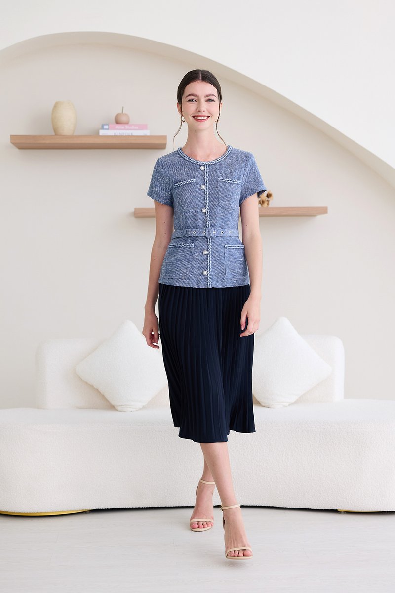 top: tweed material, non-stretchable