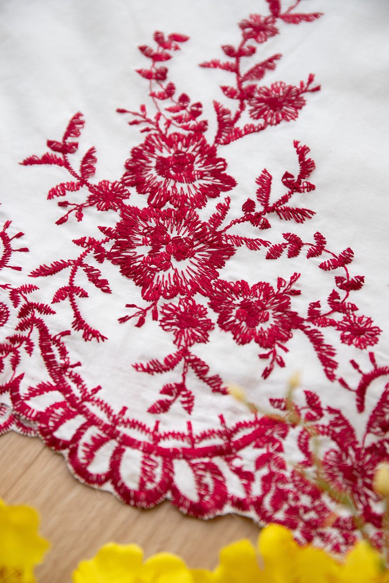 embroidered cotton blend material, non-stretchable