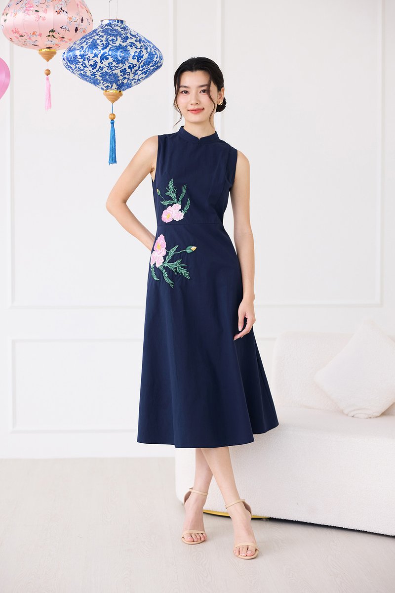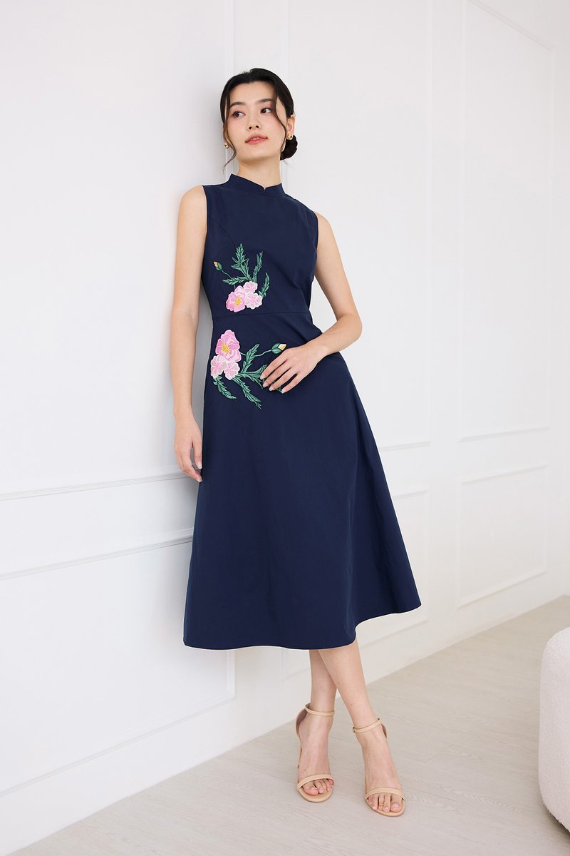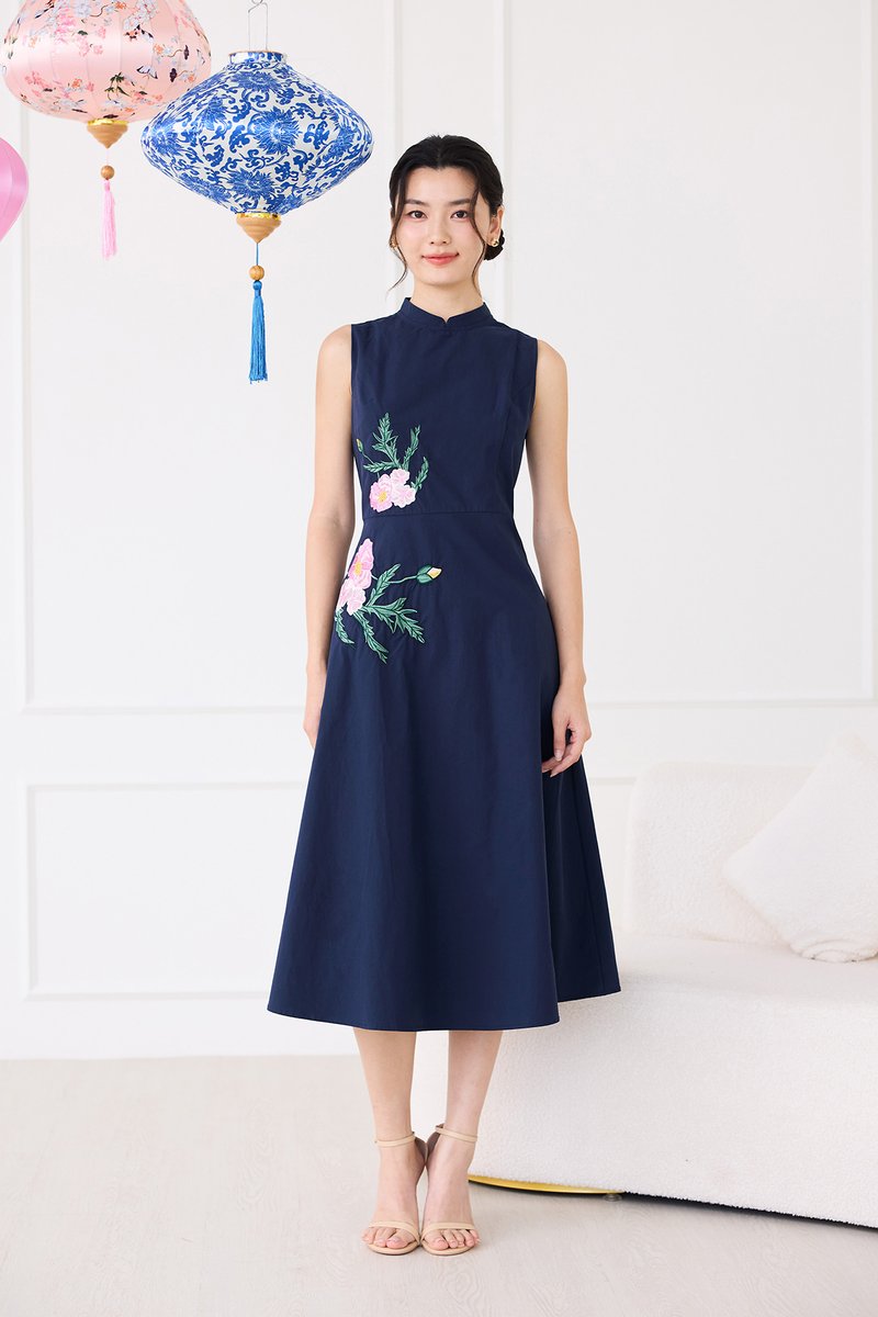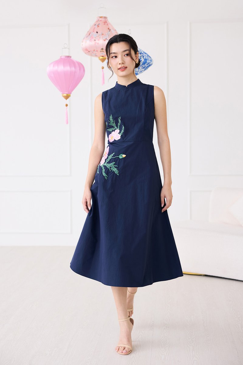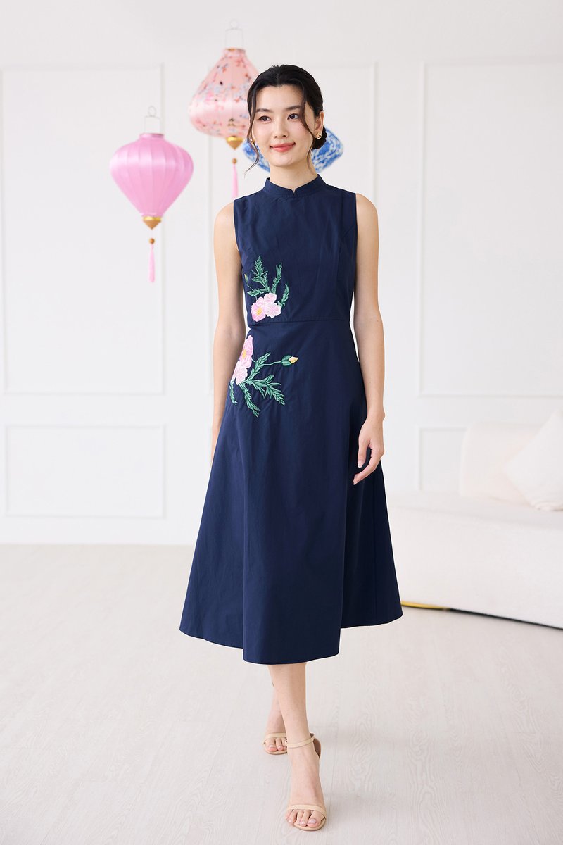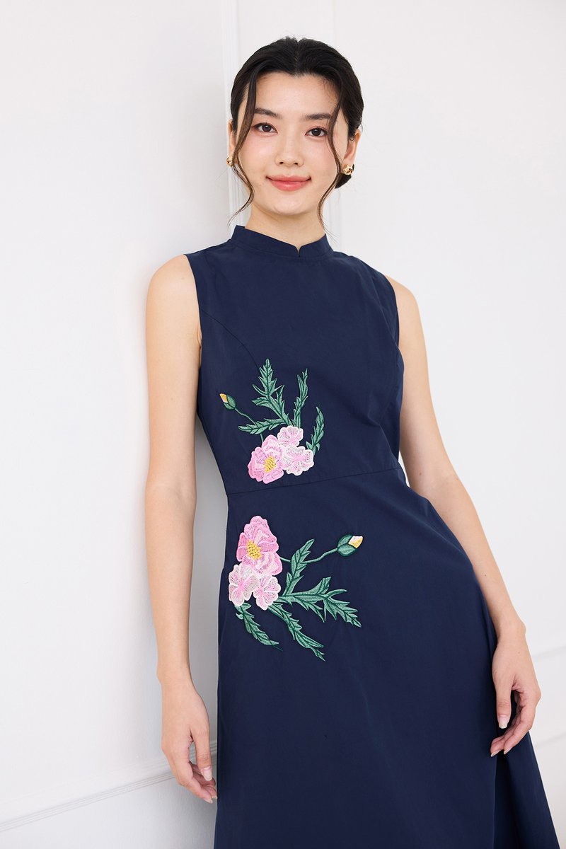 Blooms Adorned Cheongsam Dress In Navy Blue
