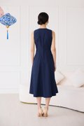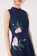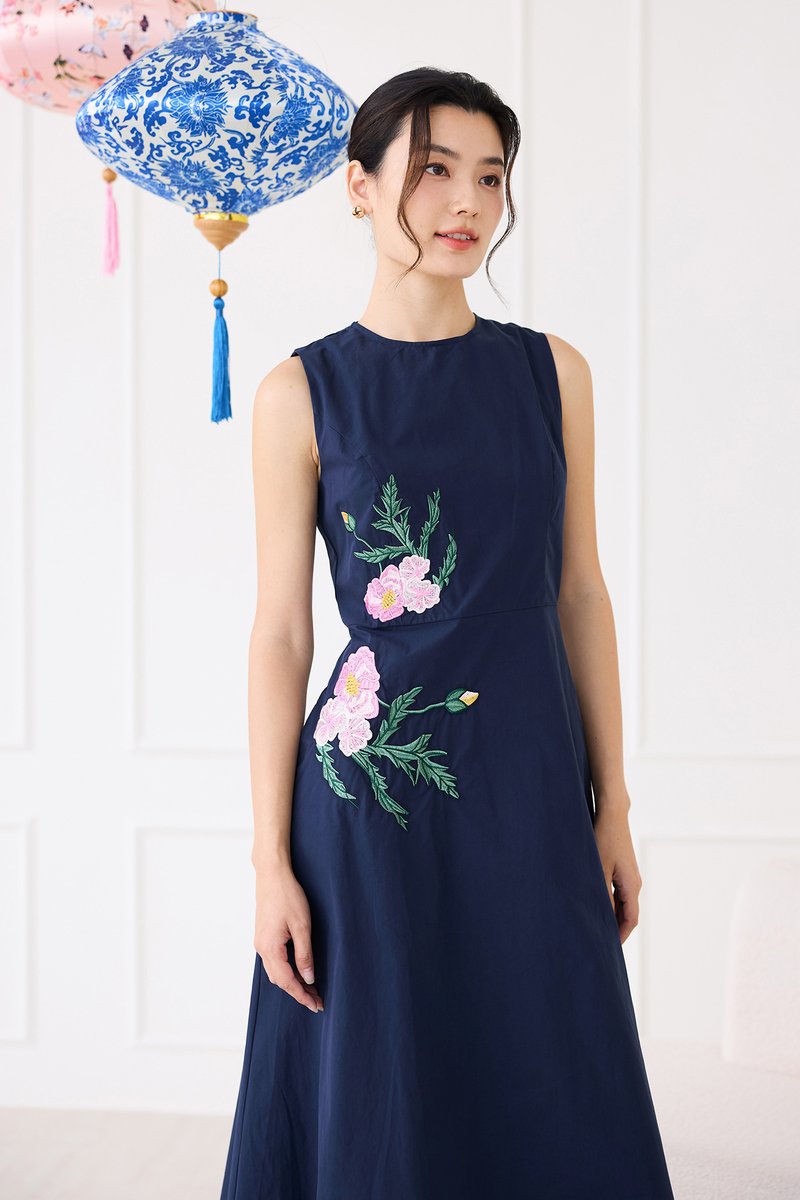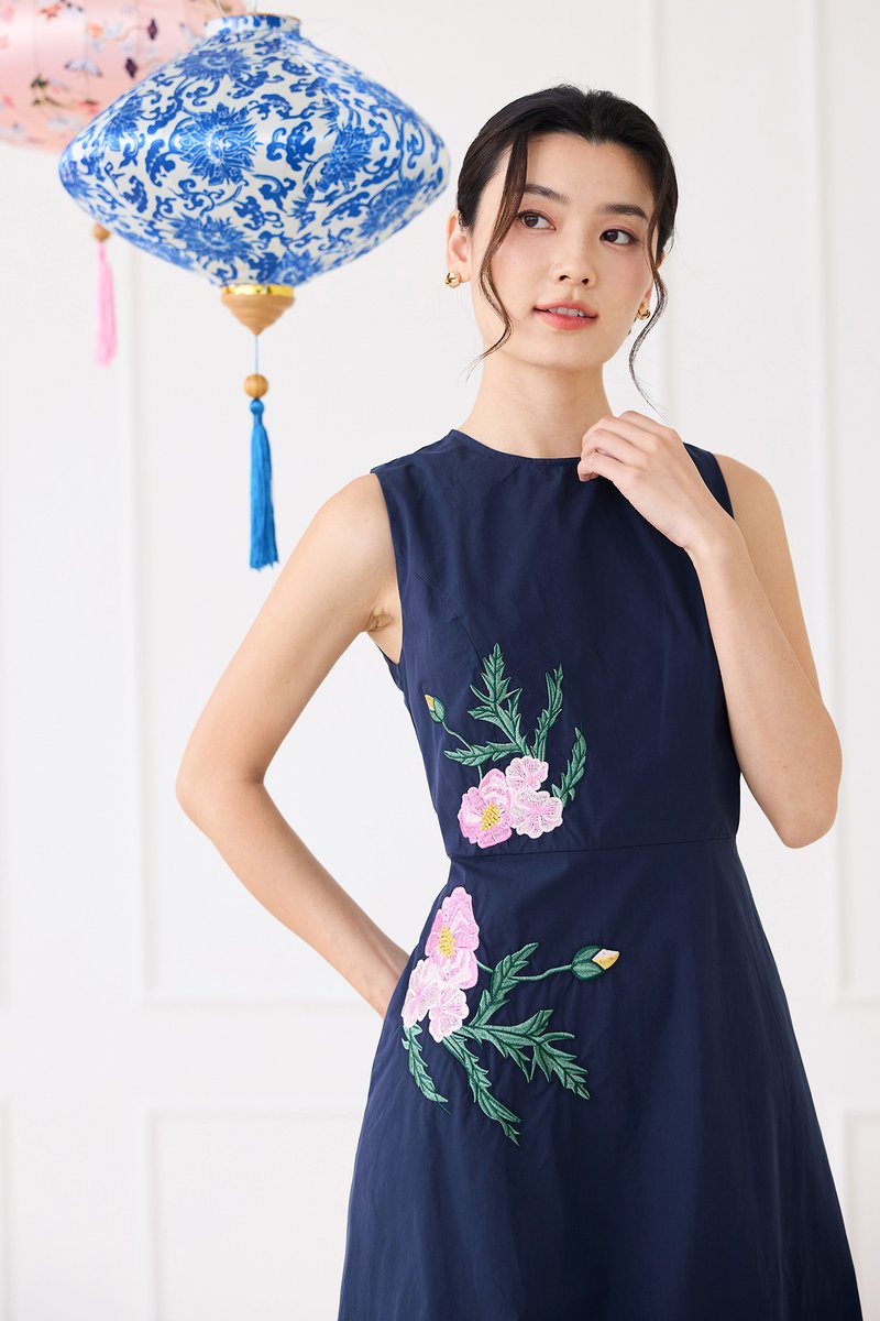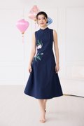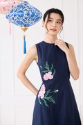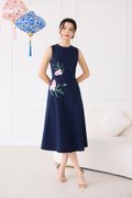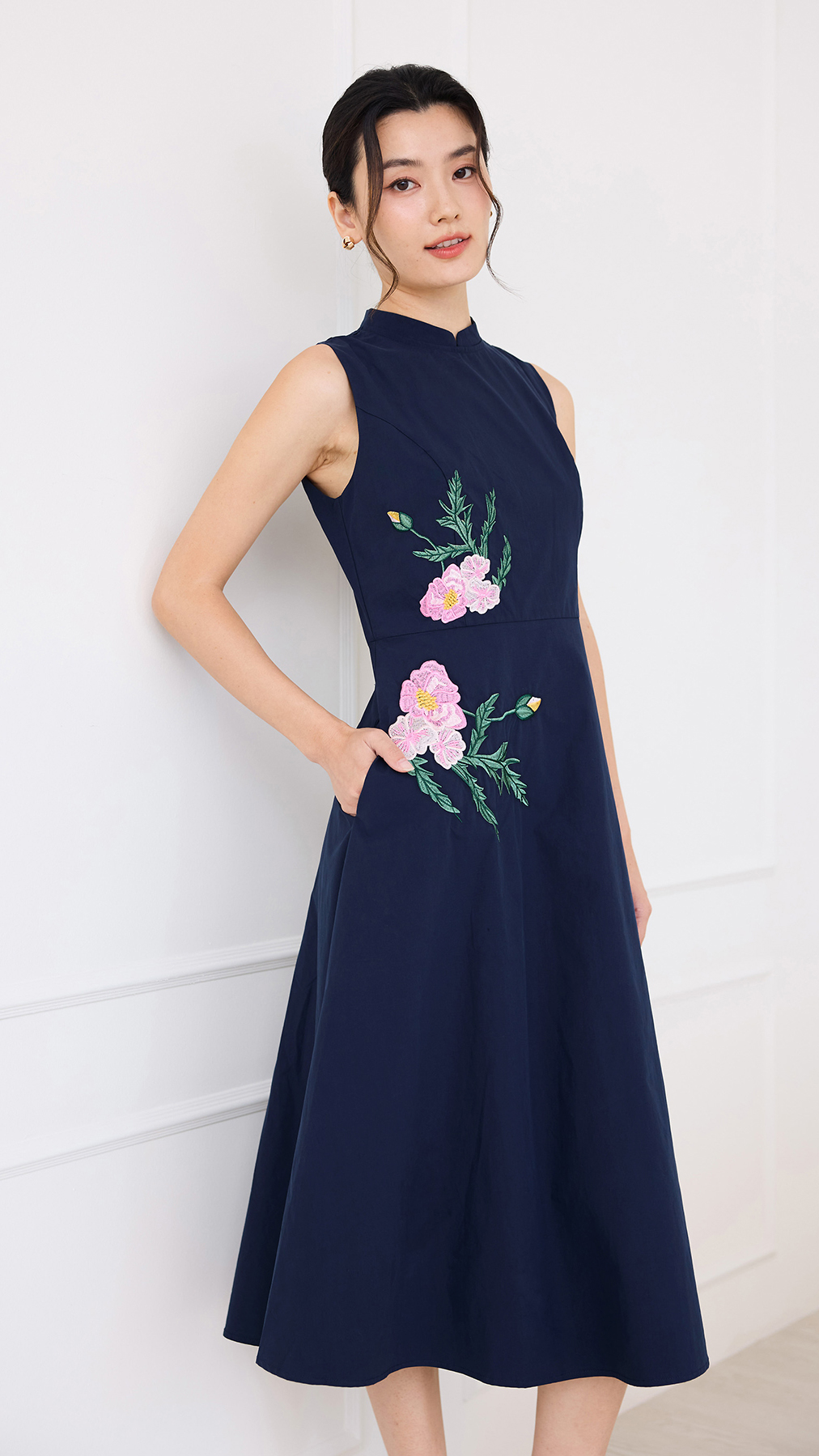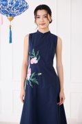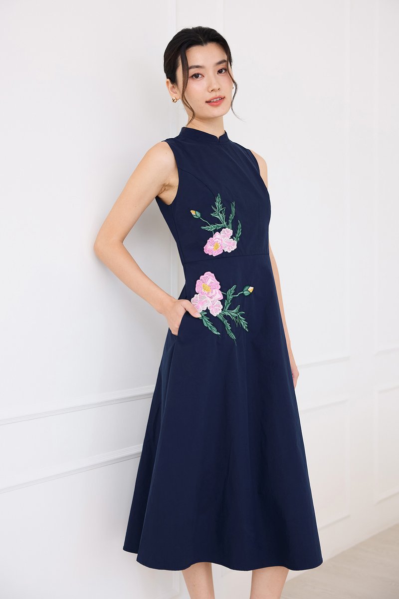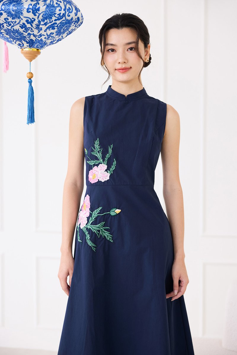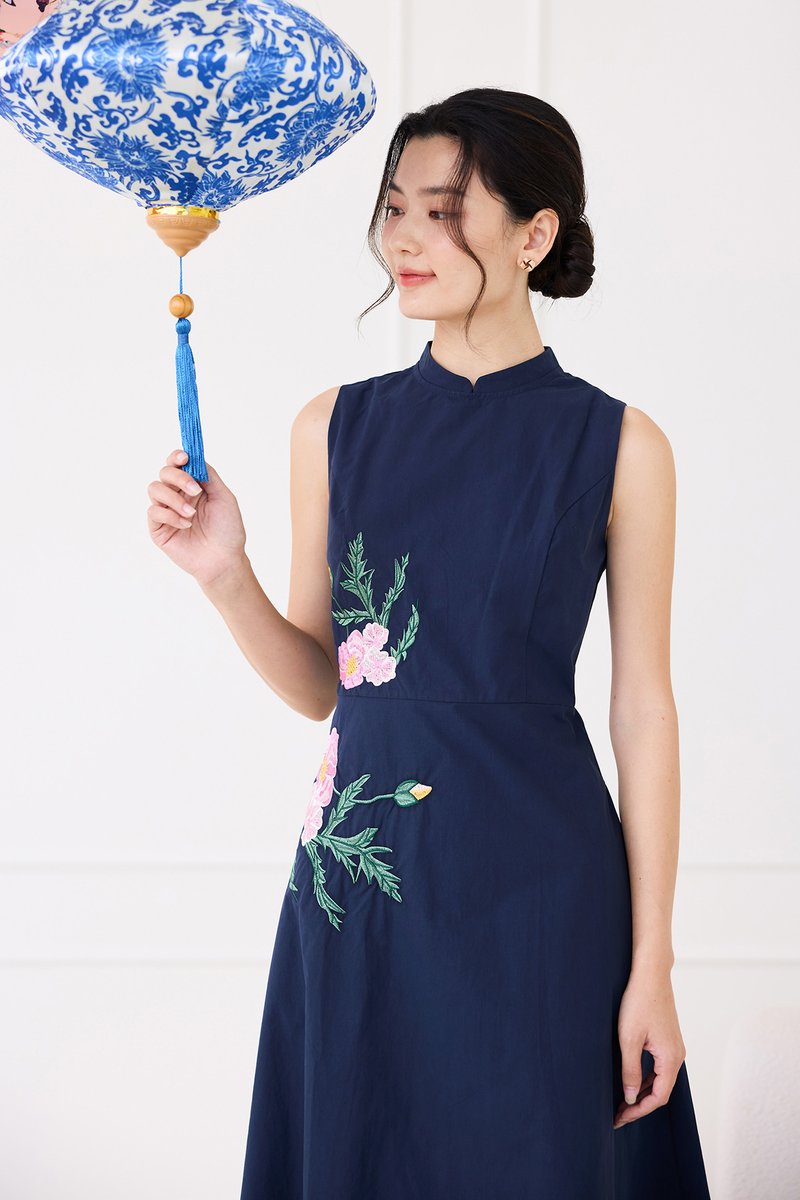 Blooms Adorned Cheongsam Dress In Navy Blue