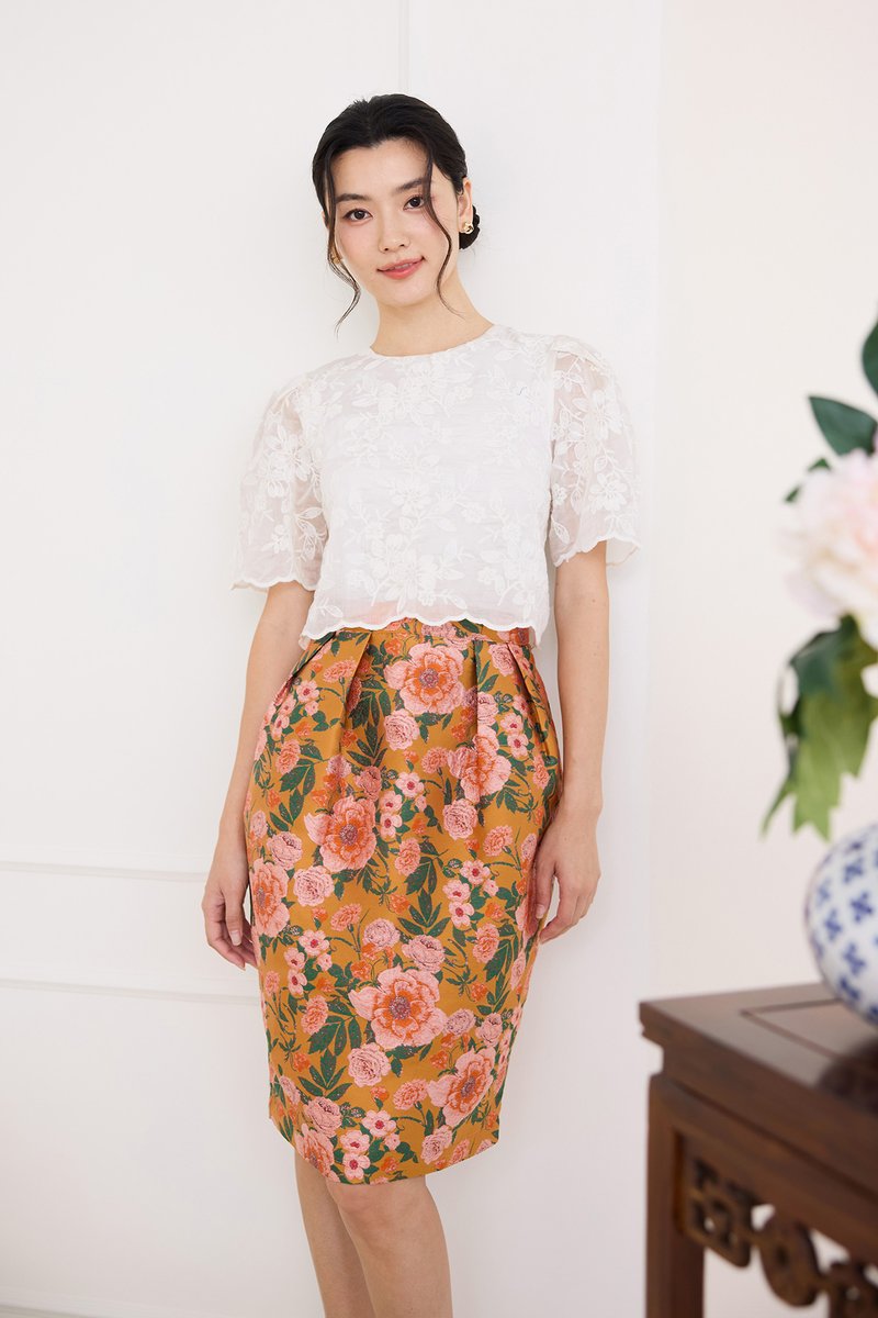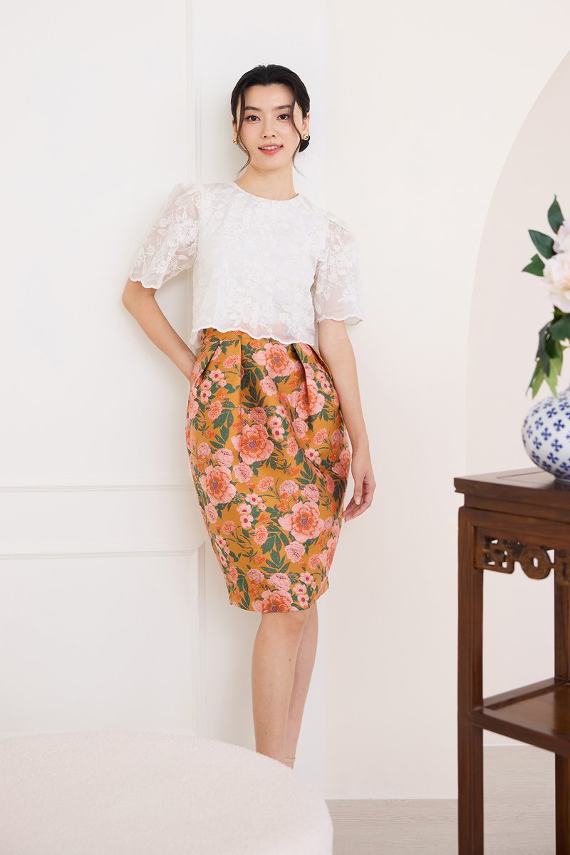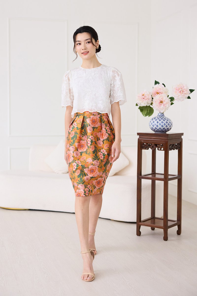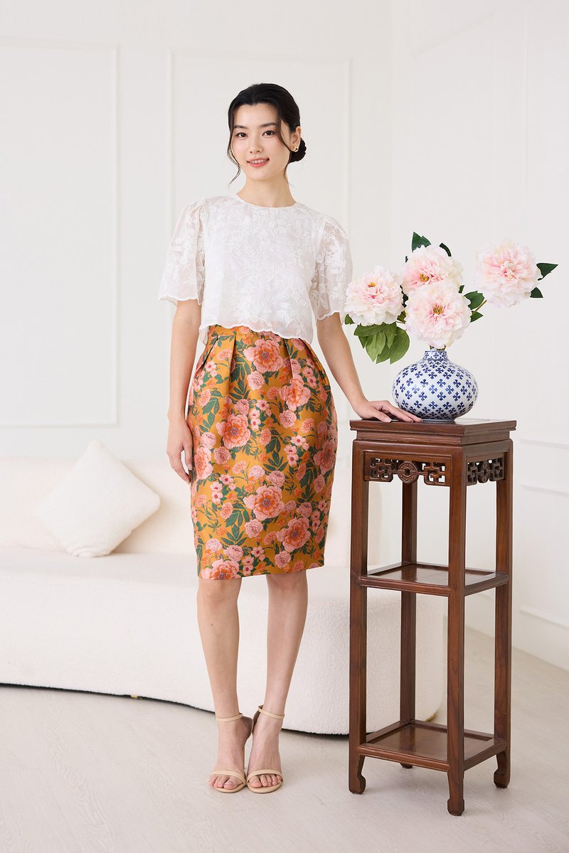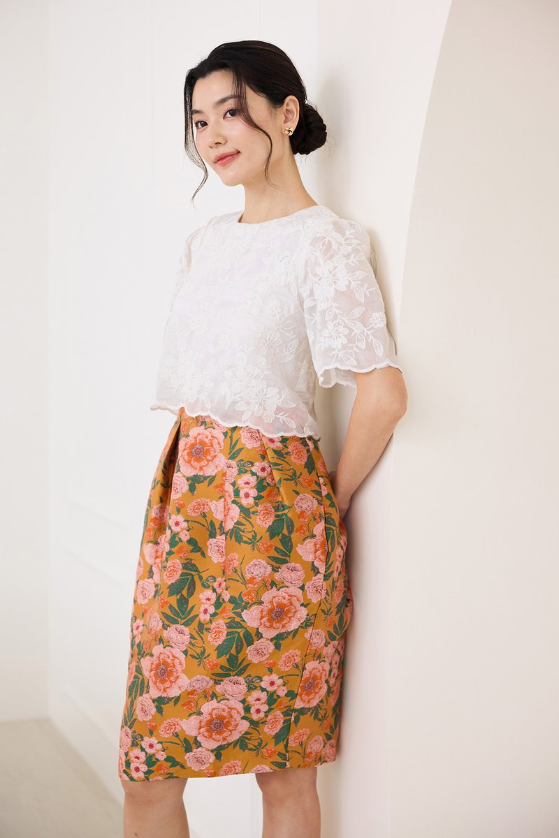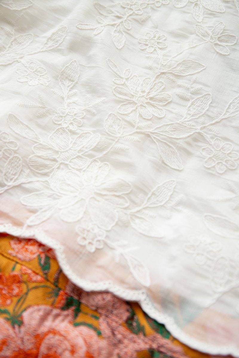 top: embroidered cotton material, non-stretchable
