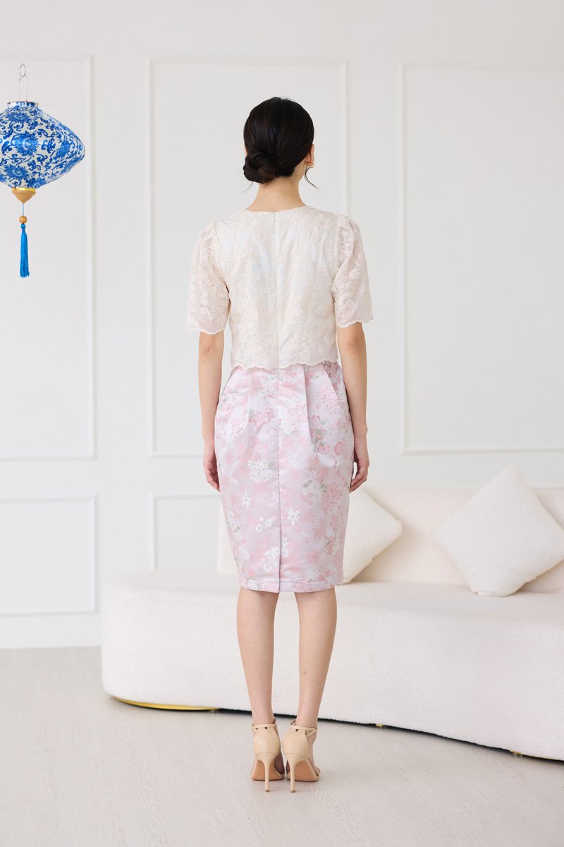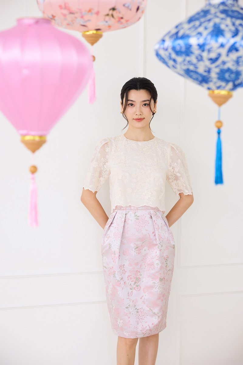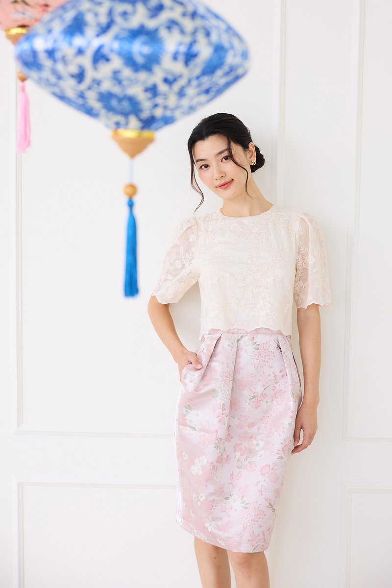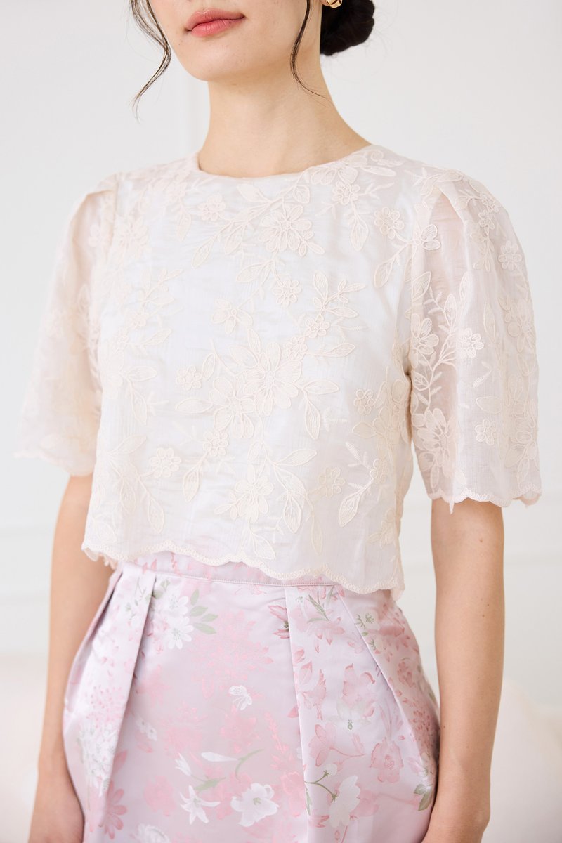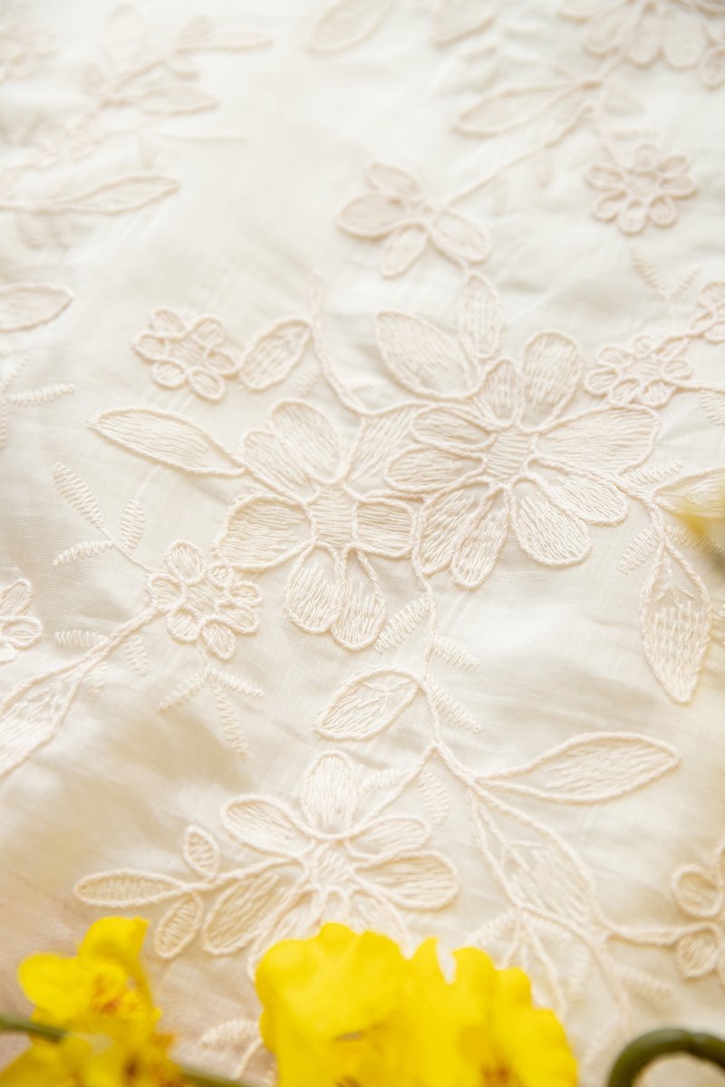 top: embroidered cotton material, non-stretchable